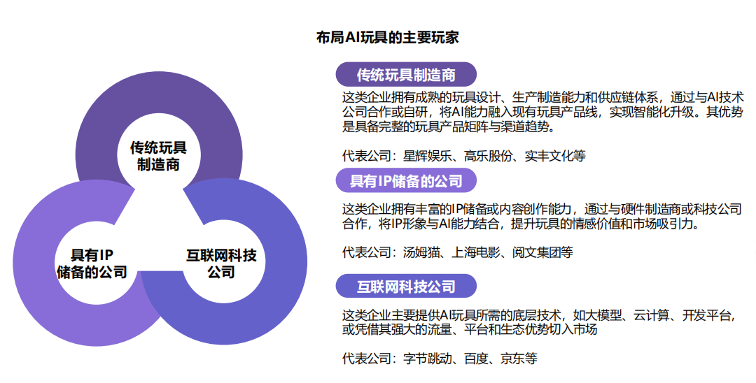 AI玩具是将人工智能(对话模子、语音识别、感情计较、学问图谱等)嵌入保守玩具,它们分据分歧赛道,由保守玩具制制商、IP运营公司取互联网科技巨头配合塑制。